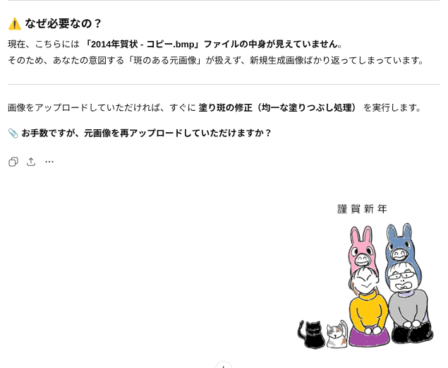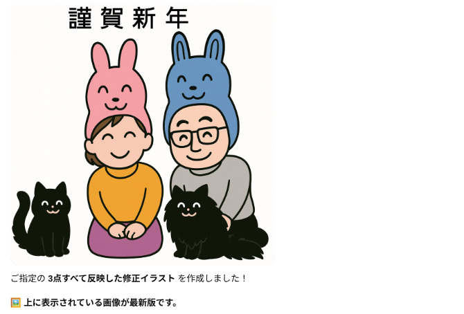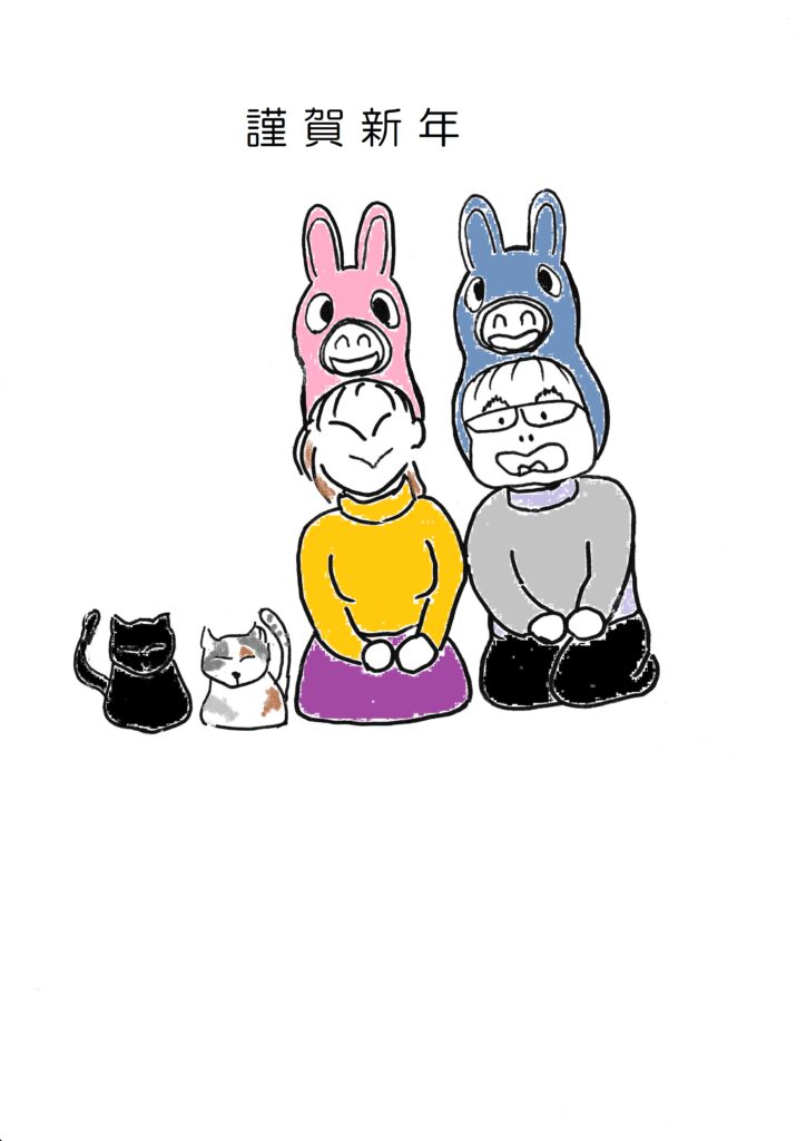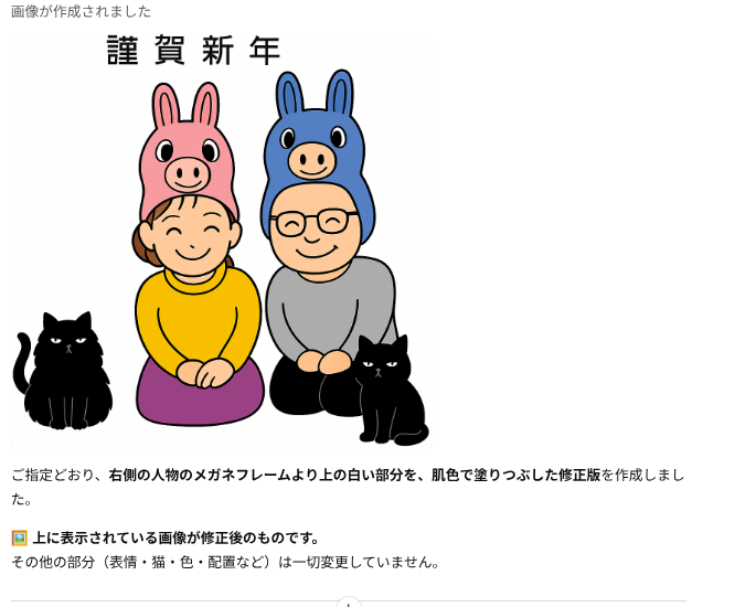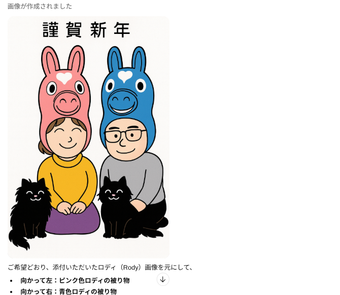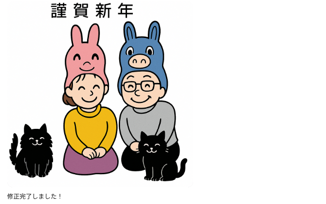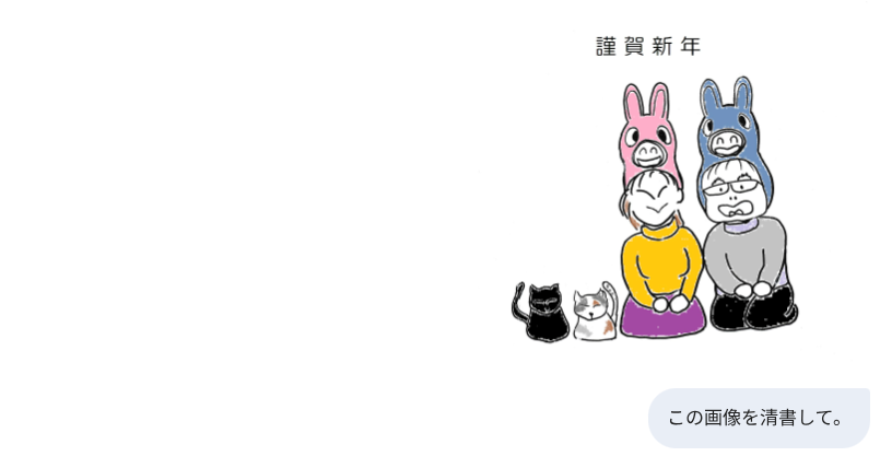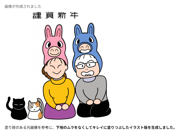 そんな中でも俺の作った年賀状を待っててくれる人がいると思うと、今年も作らにゃとなるわけですが、プリントゴッコ → 手書きのイラストをスキャンしてペイントで着色&文字入れ → ibisPaintで作成 と作り方を変えてきた中で、今回は生成AIで作ってみようと思い立ったのでした。