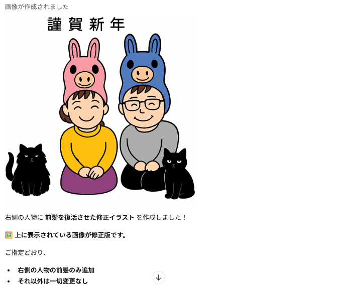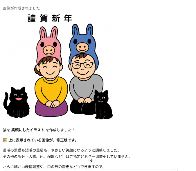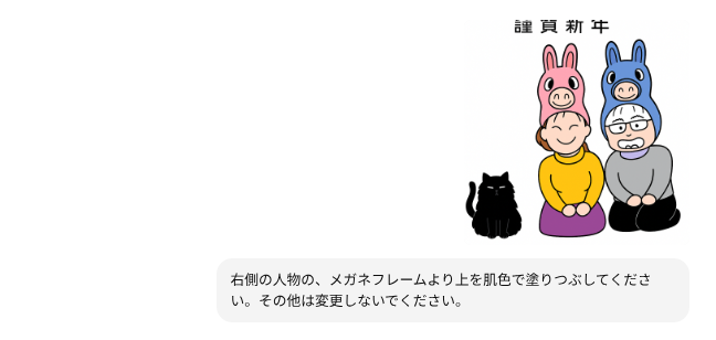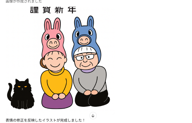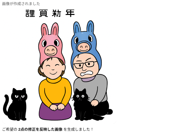 画像生成が可能な生成AIであれば、西暦と年賀状ってキーワードだけで干支いりのイラストが生成できましたので、「門松」とか「羽子板」みたいな正月っぽいキーワードで指示すればそれなりの年賀状が作れるものと思います。