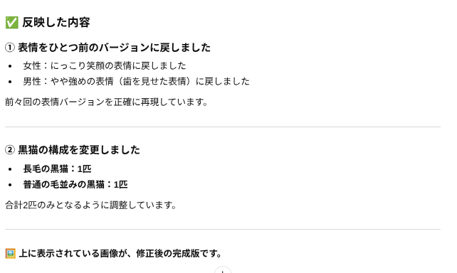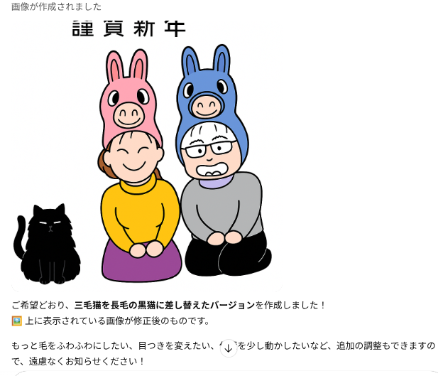 おじいちゃんはイタダケないし、猫ちゃんも足りないのでもう一回同じように具体例を示してプロンプト投入。