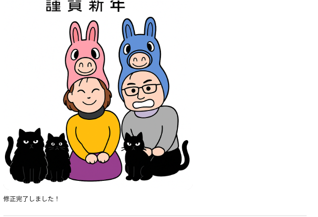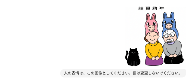 こちら、「手書きのイラストをスキャンしてペイントで着色&文字入れ」したもので、塗りつぶしにムラがあり雑な感じがします。また、黒猫と三毛猫も亡くなっていて、いまは黒猫二匹なのでそれもアップデートしたいなと。