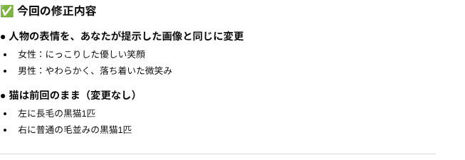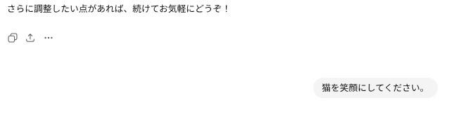 ちょっと猫がムスッとしているので、以下のプロンプトを投入。