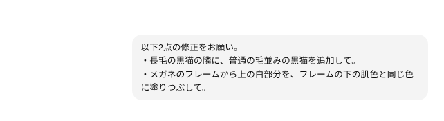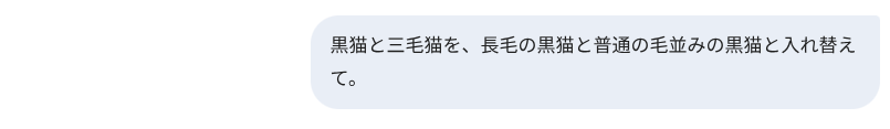 黒猫&三毛猫を、黒猫(そのまま)&長毛の黒猫に とのプロンプトのつもりが、生成されたのは以下。